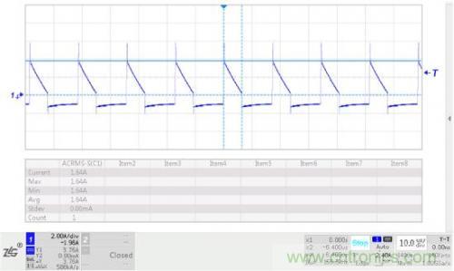 測試電解電容紋波電流時,需將電容引腳穿入電流探頭中,通過示波器可讀得交流有效值。本設(shè)計實例的紋波電流測試結(jié)果如圖3所示,示波器讀得有效紋波電流為1.64A,與理論設(shè)計接近。因此理論計算具有較大的工程指導(dǎo)意義。