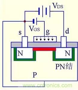 在一塊濃度較低的P型硅上擴(kuò)散兩個(gè)濃度較高的N型區(qū)作為漏極和源極,半導(dǎo)體表面覆蓋二氧化硅絕緣層并引出一個(gè)電極作為柵極。