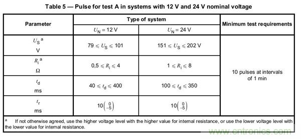 在新的汽車ISO標(biāo)準(zhǔn)中,拋負(fù)載測試已經(jīng)采用ISO-16750-2 (2010) 替代了舊標(biāo)準(zhǔn) ISO-7637-2 (2004)。 在這2個標(biāo)準(zhǔn)中最大的區(qū)別就是新標(biāo)準(zhǔn)要求10分鐘10個波形,而舊的7637-2只是要求測試1次拋負(fù)載波形。而測試的Us電壓要求也更嚴(yán)格了,從原來的174V限制提高到202V,具體請參考標(biāo)準(zhǔn)中的表格:
