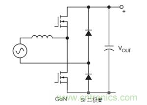 一種替代方案是連續(xù)導(dǎo)通模式圖騰柱拓?fù)?。這種拓?fù)浣Y(jié)構(gòu)充分利用了GaN的所有關(guān)鍵特性,最終導(dǎo)致尺寸更小、工作頻率更高的設(shè)計(jì)(圖4)。GaN的零反向恢復(fù)對(duì)于實(shí)現(xiàn)該拓?fù)涮貏e重要。