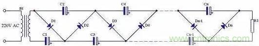 二倍壓電路還可以很容易的擴展為n倍壓電路,具體電路見圖16。