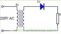 半波整流電路見下圖。其中B1是電源變壓器,D1是整流二極管,R1是負載。B1次級是一個方向和大小隨時間變化的正弦波電壓,波形如圖2所示。0~π期間是這個電壓的正半周,這時B1次級上端為正下端為負,二極管D1正向?qū)?,電源電壓加到負載R1上,負載R1中有電流通過;π~2π期間是這個電壓的負半周,這時B1次級上端為負下端為正,二極管D1反向截止,沒有電壓加到負載R1上,負載R1中沒有電流通過。在 2π~3π、3π~4π等后續(xù)周期中重復上述過程,這樣電源負半周的波形被“削”掉,得到一個單一方向的電壓,波形如圖3所示。由于這樣得到的電壓波形大小還是隨時間變化,我們稱其為脈動直流。