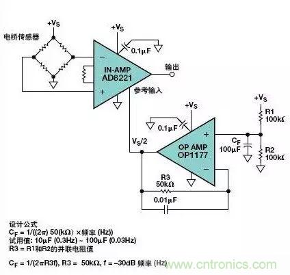 上面示出的CF試用值能夠提供大約0.03 Hz的–3 dB極點(diǎn)頻率。接在R3兩端的小電容器(0.01 μF)可使電阻器噪聲最小。