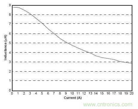 通過已經(jīng)計算的電感峰值電流,我們可以發(fā)現(xiàn)電感上產(chǎn)生了什么。很容易會知道,隨著通過電感的電流增加,它的電感量會減小。這是由于磁芯材料的物理特性決定 的。電感量會減少多少就很重要了:如果電感量減小很多,轉(zhuǎn)換器就不會正常工作了。當(dāng)通過電感的電流大到電感實效的程度,此時的電流稱為“飽和電流”。這也 是電感的基本參數(shù)。