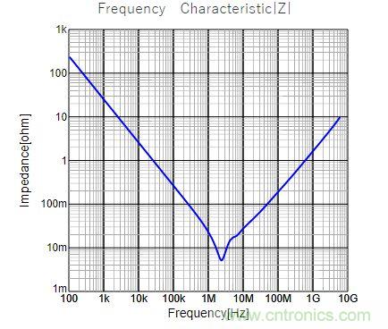 MLCC有經(jīng)典的V型阻抗-頻率曲線。隨著頻率升高,寄生電感的影響開始凸顯,阻抗先變小再變大,這是MLCC的固有特性。曲線中的最低點(diǎn)就是MLCC的自諧振頻率。