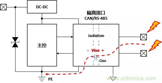 帶隔離通信接口的設(shè)備,在不同的使用、安裝狀態(tài)下,接口會表現(xiàn)出完全不同的ESD特性,了解設(shè)備在不同的使用狀態(tài)下,ESD對接口的影響的機(jī)理,才能有針對性地增加保護(hù)器件,提升隔離接口的ESD能力。下面以帶有隔離CAN或RS-485通信接口為例,對常見的設(shè)備狀態(tài)下,ESD的作用機(jī)理進(jìn)行分析,并提出相應(yīng)的改善措施。