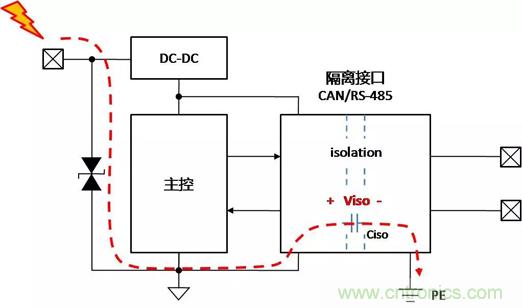當(dāng)總線側(cè)接口受到靜電放電時,靜電能量通過隔離接口模塊內(nèi)部總線側(cè)器件泄放至PE,如圖 7。若ESD能量超出了接口模塊內(nèi)部總線側(cè)器件的ESD抗擾能力,總線接口則可能損壞。