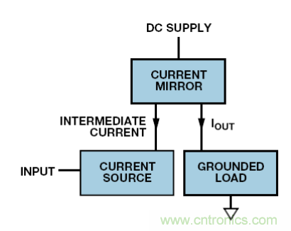 若電流或電壓輸入?yún)⒖嫉兀瑒t必須使用電平轉(zhuǎn)換。有多個(gè)電路可以實(shí)現(xiàn);而圖 8 中的系統(tǒng)在很多場合下都適用。這款簡單的電路采用接地電流源驅(qū)動(dòng)直流電源上的電流鏡,從而驅(qū)動(dòng)負(fù)載。注意,電流鏡可能有增益,因此信號電流不需要像負(fù)載電流那么高。