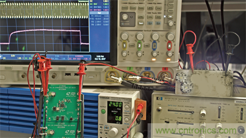 LT3932演示電路(DC2286A)設計為通過一個或兩個LED(作為降壓LED驅動器)驅動1 A的LED電流。如圖1所示,它很容易進行更改和并聯(lián),以實現更高電流、更高電壓或并聯(lián)運行。圖4顯示了如何將兩個這樣的電路輕松連接在一起,從24 V輸入以10μs、3 A脈沖驅動4個LED。出于測試目的,脈沖發(fā)生器可用于提供同步時鐘信號,如圖4所示。在量產機器視覺系統(tǒng)中,可利用時鐘芯片生成同步時鐘信號和PWM脈沖。如需更高電流脈沖,可使用相同的并聯(lián)方案添加更多演示電路DC2286A轉換器。