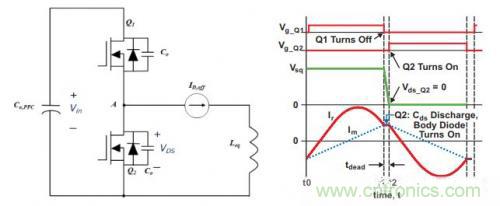 因此選擇合適的MOSFET(足夠小的等效寄生電容),對于ZVS的實現(xiàn)至關(guān)重要,尤其是當(dāng)Vds接近于0的時候,等效輸出電容要足夠小,這樣還可以進(jìn)一步降低死區(qū)時間并提高LLC的工作效率。