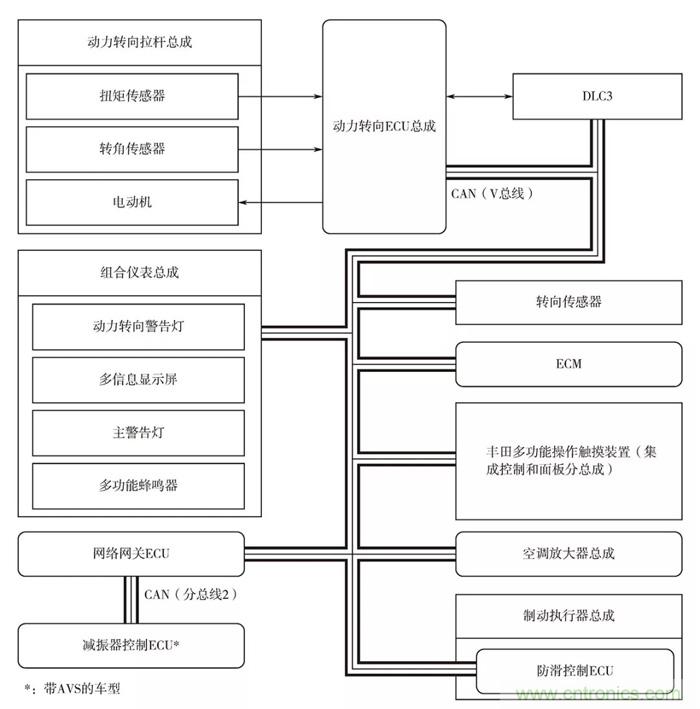 在分析方框圖了解信號或電流傳輸過程時(shí),應(yīng)認(rèn)真查看圖中的箭頭方向,箭頭方向表示信號的傳輸方向。如果沒有箭頭方向,則可根據(jù)方框圖的圖形符號來判斷。箭頭如果是雙向的,表示信號既能輸入也能輸出;方框圖中粗線條表示CAN總線,下圖所示為2016 款皇冠EPS系統(tǒng)方框圖(系統(tǒng)圖)。對方框圖有整體的了解后,應(yīng)進(jìn)一步弄清系統(tǒng)(整車或系統(tǒng))共有幾個(gè)框(多少部件),框與框之間存在何種關(guān)系,再對照電路原理圖,就可以對電路理解得更為深刻。