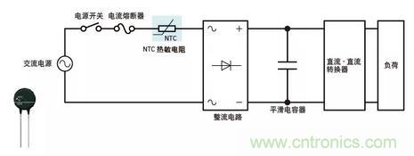 如下圖所示,通過插入NTC熱敏電阻來限制SMPS的勵磁涌流被廣泛地用作形成用于限制電源中的勵磁涌流的低成本簡易電路的方式。即使在整流器電路之后連接NTC熱敏電阻,也可以得到相同的結(jié)果。