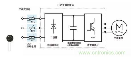 逆變器系統(tǒng)包括轉(zhuǎn)換器部分、逆變器部分和安裝在轉(zhuǎn)換器部分之后的直流鏈路電容器(平滑電容器)。啟動時,裝置充電,峰值比穩(wěn)定電流大幾倍的勵磁涌流充滿直流鏈路電容器。這種勵磁涌流可能對直流電容器的使用壽命產(chǎn)生有害影響或破壞半導(dǎo)體器件。為了防止勵磁涌流,所以連接NTC熱敏電阻(電源熱敏電阻)。