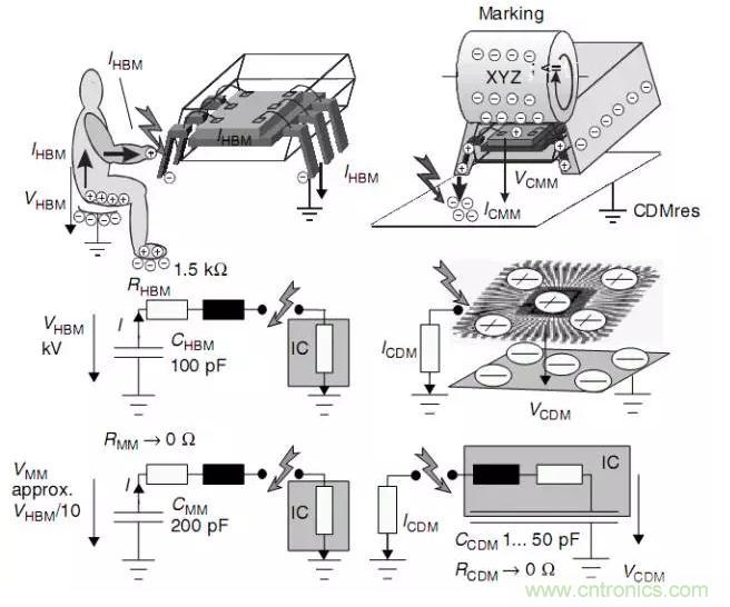 1、人體放電模式(HBM):當(dāng)然就是人體摩擦產(chǎn)生了電荷突然碰到芯片釋放的電荷導(dǎo)致芯片燒毀擊穿,秋天和別人觸碰經(jīng)常觸電就是這個原因。業(yè)界對HBM的ESD標(biāo)準(zhǔn)也有跡可循(MIL-STD-883C method 3015.7,等效人體電容為100pF,等效人體電阻為1.5Kohm),或者國際電子工業(yè)標(biāo)準(zhǔn)(EIA/JESD22-A114-A)也有規(guī)定,看你要follow哪一份了。如果是MIL-STD-883C method 3015.7,它規(guī)定小于<2kV的則為Class-1,在2kV~4kV的為class-2,4kV~16kV的為class-3。