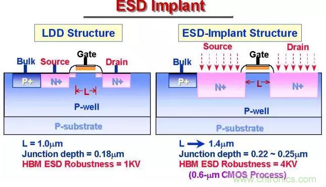 1) Source/Drain的ESD implant:因為我們的LDD結(jié)構(gòu)在gate poly兩邊很容易形成兩個淺結(jié),而這個淺結(jié)的尖角電場比較集中,而且因為是淺結(jié),所以它與Gate比較近,所以受Gate的末端電場影響比較大,所以這樣的LDD尖角在耐ESD放電的能力是比較差的(<1kV),所以如果這樣的Device用在I/O端口,很容造成ESD損傷。所以根據(jù)這個理論,我們需要一個單獨的器件沒有LDD,但是需要另外一道ESD implant,打一個比較深的N+_S/D,這樣就可以讓那個尖角變圓而且離表面很遠,所以可以明顯提高ESD擊穿能力(>4kV)。但是這樣的話這個額外的MOS的Gate就必須很長防止穿通(punchthrough),而且因為器件不一樣了,所以需要單獨提取器件的SPICE Model。
