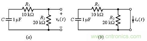 在圖5a的電路中,由vn表示的節(jié)點和地之間的阻抗為Z(s)=R||(1/sC)=R/(1+sRC),因此在s=-1/(RC)=-1/(1ms)時電路具有一個極點。假設vn(0)=1V,我們可以得到: