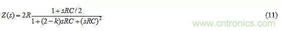 其中R2代表電位器在其左端和游標之間的部分。對于給定的元件值,從左端到右端改變游標將使k在0<k<2的范圍內變化?,F在,R3上的電壓為(1+k)vn–vn,即kvn,在右邊是正的,表明R3將為C提供電流kvn/R3。鑒于R從C中汲取電流vn/R,因此從C流出的凈電流為iC=vn[1/R+1/(-R3/k)],表明C視R與一個負電阻–R3/k并聯,凈等效電阻Req=R||(–R3/k)]。擴展后可以得到: