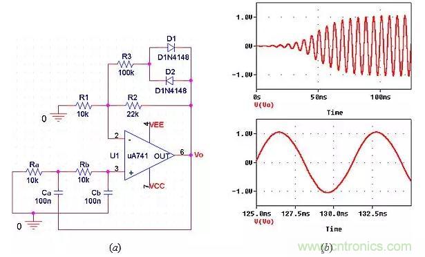 在圖11a中,電源接通時,兩個二極管仍然關閉,因此k=R2/R1=22/10=2.2,表明振蕩增加。隨著振蕩的增加,二極管在交替的半周期內逐漸導通,所以k=[R2||(R3+rd)]/R1,其中rd是動態(tài)二極管電阻(rd隨二極管電流而減?。?。在rd<<R3的極限情況下,我們將得到k=(22||100)/10=1.8,表示電路可在1.8<k<2.2的范圍內調整k的值,這包括k=2.0時持續(xù)振蕩達到所需幅度的情況。