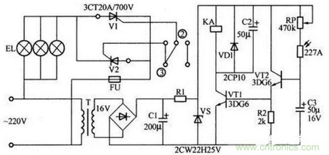 白天在較強(qiáng)光照下,光導(dǎo)管227A(一種光敏電阻)兩端阻值很小,約20~50kΩ,晶體管VT2獲得基極電流而導(dǎo)通,VT1從R2上得到正偏電壓也導(dǎo)通,繼電器線圈KA得電,繼電器的常閉觸電②、③斷開,兩只晶閘管V1和V2沒(méi)有觸發(fā)信號(hào)而不導(dǎo)通,因而燈泡EL不亮。
