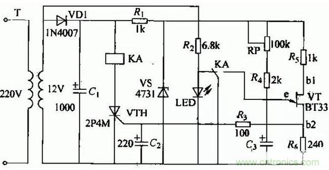 電容G上電壓按指數(shù)規(guī)律逐漸升高,當(dāng)此電壓大于單結(jié)晶體管VT的峰點(diǎn)電壓時(shí),單結(jié)晶體管導(dǎo)通,G經(jīng)VT的eb1極和風(fēng)放電,在風(fēng)上輸出脈沖電壓,觸發(fā)藩閘管VTH導(dǎo)通使繼電器KA吸合,KA的觸頭同時(shí)將C3短路,使之迅速放電,單結(jié)晶體管的ebl之間電壓迅速下降,當(dāng)降到Vr.的谷點(diǎn)電壓時(shí),Vr關(guān)閉。同時(shí)LED指示燈點(diǎn)亮。當(dāng)切斷電源時(shí),繼電器KA釋放,電路恢復(fù)原始狀態(tài),等待下次動(dòng)作。通過(guò)調(diào)節(jié)RP.可以調(diào)整延時(shí)時(shí)間。