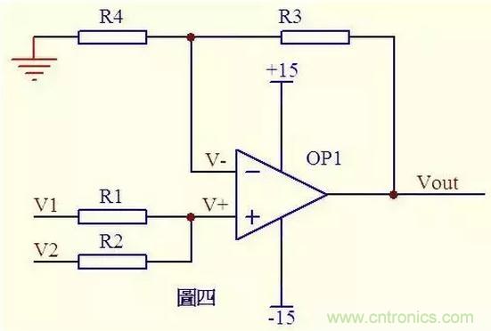 請看圖四。因?yàn)樘摂?,運(yùn)放同向端沒有電流流過,則流過R1和R2的電流相等,同理流過R4和R3的電流也相等。故 (V1 – V+)/R1 = (V+ - V2)/R2 ……a (Vout – V-)/R3 = V-/R4 ……b 由虛短知: V+ = V- ……c 如果R1=R2,R3=R4,則由以上式子可以推導(dǎo)出 V+ = (V1 + V2)/2 V- = Vout/2 故 Vout = V1 + V2 也是一個加法器。