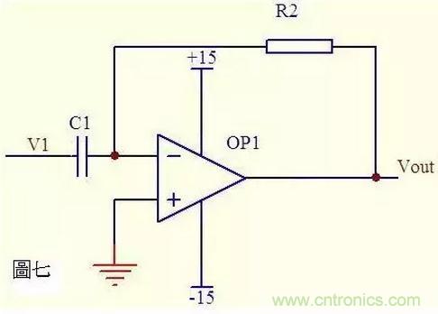 圖七中由虛斷知,通過電容C1和電阻R2的電流是相等的,由虛短知,運(yùn)放同向端與反向端電壓是相等的。則: Vout = -i * R2 = -(R2*C1)dV1/dt 這是一個微分電路。如果V1是一個突然加入的直流電壓,則輸出Vout對應(yīng)一個方向與V1相反的脈沖。