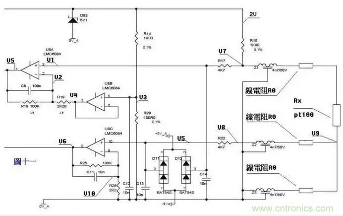 來一個復(fù)雜的,圖十一是一個三線制PT100前置放大電路。PT100傳感器引出三根材質(zhì)、線徑、長度完全相同的線,接法如圖所示。有2V的電壓加在由R14、R20、R15、Z1、PT100及其線電阻組成的橋電路上。Z1、Z2、Z3、D11、D12、D83及各電容在電路中起濾波和保護(hù)作用,靜態(tài)分析時(shí)可不予理會,Z1、Z2、Z3可視為短路,D11、D12、D83及各電容可視為開路。 由電阻分壓知, V3=2*R20/(R14+20)=200/1100=2/11 ……a 由虛短知,U8B第6、7腳 電壓和第5腳電壓相等 V4=V3 ……b 由虛斷知,U8A第2腳沒有電流流過,則流過R18和R19上的電流相等。 (V2-V4)/R19=(V5-V2)/R18 ……c 由虛斷知,U8A第3腳沒有電流流過, V1=V7 ……d 在橋電路中R15和Z1、PT100及線電阻串聯(lián),PT100與線電阻串聯(lián)分得的電壓通過電阻R17加至U8A的第3腳, V7=2*(Rx+2R0)/(R15+Rx+2R0) …..e 由虛短知,U8A第3腳和第2腳電壓相等, V1=V2 ……f 由abcdef得, (V5-V7)/100=(V7-V3)/2.2 化簡得 V5=(102.2*V7-100V3)/2.2 即 V5=204.4(Rx+2R0)/(1000+Rx+2R0) – 200/11 ……g 上式輸出電壓V5是Rx的函數(shù) 我們再看線電阻的影響。Pt100最下端線電阻上產(chǎn)生的電壓降經(jīng)過中間的線電阻、Z2、R22,加至U8C的第10腳,由虛斷知, V5=V8=V9=2*R0/(R15+Rx+2R0) ……a (V6-V10)/R25=V10/R26 ……b 由虛短知, V10=V5 ……c 由式abc得 V6=(102.2/2.2)V5=204.4R0/[2.2(1000+Rx+2R0)] ……h 由式gh組成的方程組知,如果測出V5、V6的值,就可算出Rx及R0,知道Rx,查pt100分度表就知道溫度的大小了。