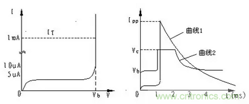 如果用圖示儀觀察TVS的特性,就可得到圖1中左圖所示的波形。如果單就這個(gè)曲線來(lái)看,TVS管和普通穩(wěn)壓管的擊穿特性沒(méi)有什么區(qū)別,為典型的PN結(jié)雪崩器件。
