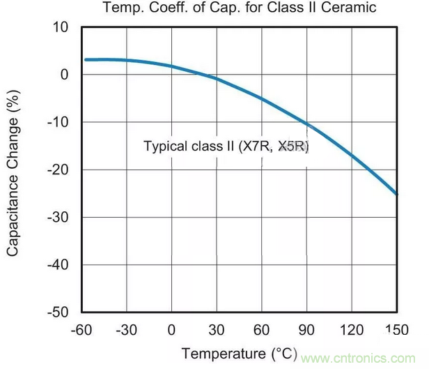 用于替換最可能的MLCC候選者采用“II類”電介質(zhì)材料。這種II類陶瓷(通常為X7R或X5R)的容值會(huì)在溫度范圍內(nèi)變化,這種特征稱為電容溫度系數(shù)(TCC),參見(jiàn)圖1。