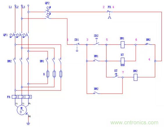 轉(zhuǎn)子回路中的3組啟動電阻,由接觸器2KM、3KM、4KM在時間繼電器1KT、2KT、KT3的控制下被順序短接;在正常工作時,只有接觸器1KM和2KM的主觸點閉合。