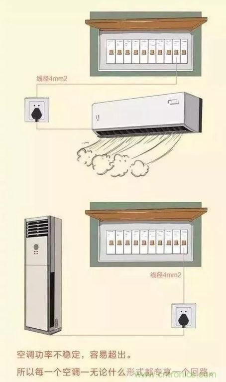 家裝中的空調(diào)一般都是單獨(dú)的線路,因?yàn)榭照{(diào)功率經(jīng)常不穩(wěn)定,容易出現(xiàn)超載的可能,因此每個(gè)可調(diào)都配有一個(gè)回路。