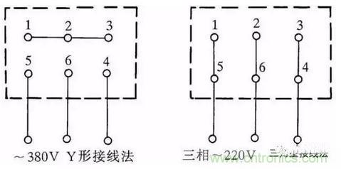 圖1:三相交流電動機(jī)Y形和△形接線方法