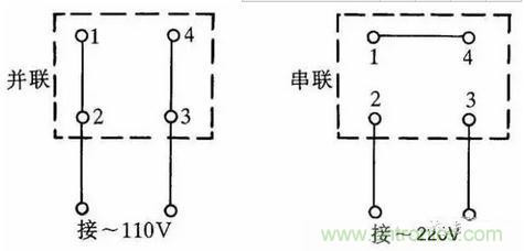 有的單相吹風(fēng)機(jī)引出4個接線端子,接線方法如圖5所示。采用并聯(lián)接法應(yīng)接入110V交流電源,采用串聯(lián)接法應(yīng)接入220V交流電源。