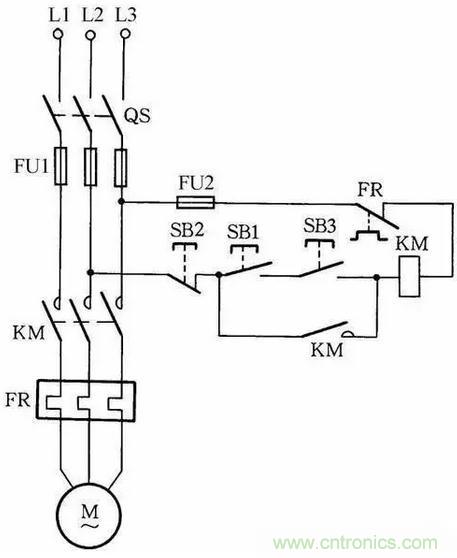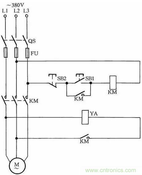 圖中SB2為停止按鈕,在停止時,按動SB2的時間要長一點。否則,手松開按鈕后,接觸器又吸合,使電動機(jī)繼續(xù)運(yùn)行。這是因為電源電壓雖被切斷,但由于慣性的作用,電動機(jī)轉(zhuǎn)子仍然轉(zhuǎn)動,其定子繞組會產(chǎn)生感應(yīng)電動勢,一旦停止按鈕很快復(fù)位,感應(yīng)電動勢直接加在接觸器線圈上,使其再次吸合,電動機(jī)繼續(xù)運(yùn)轉(zhuǎn)。