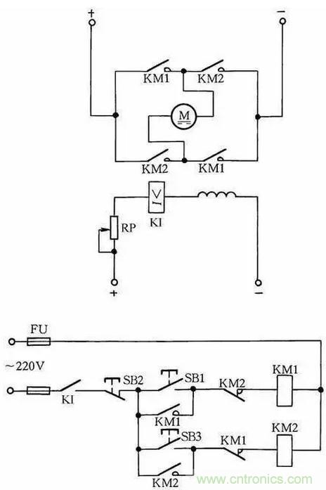 在勵磁電路內(nèi),串聯(lián)一個欠電流繼電器KI,其常開觸點接在控制電路中。當(dāng)勵磁電流消失或減小到設(shè)定值時,KI釋放,KI常開觸點斷開,切斷電動機(jī)電樞電源,使電動機(jī)停轉(zhuǎn),從而避免超速現(xiàn)象發(fā)生,見圖11。