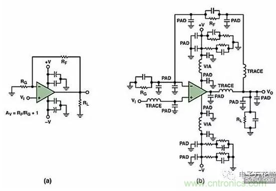 所謂寄生效應(yīng),按照字面意思就是那些出現(xiàn)在PCB板中并在電路中大施破壞、令人頭痛且原因不明的小故障。它們就是滲入高速電路中隱藏的寄生電容和寄生電感。其中包括由封裝引腳和印制線過長(zhǎng)所形成的寄生電感;焊盤(pad)到地、焊盤到電源平面和焊盤到印制線之間形成的寄生電容;通孔之間的相互影響,以及許多其他可能的寄生效應(yīng)。(圖三)(a)顯示一個(gè)典型的同相運(yùn)算放大器原理圖。但是,如果考慮寄生效應(yīng)的話,同樣的電路可能會(huì)變成圖三(b)那樣。