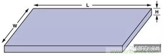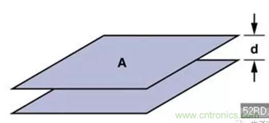 當(dāng)尋找有問題的寄生源時(shí),可能用得著幾個(gè)計(jì)算上述那些寄生電容尺寸的基本公式。(公式一)是計(jì)算平行極板電容器的公式,如(圖五)。