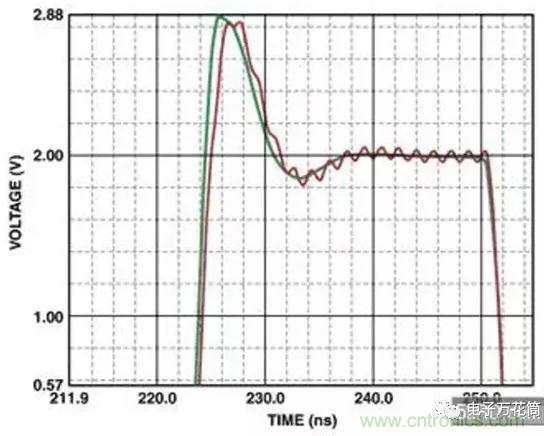 (圖七)中的震盪顯示高速運(yùn)算放大器同相輸入端長(zhǎng)度為2.54cm的印制線的影響。其等效寄生電感為29nH(10-9H),足以造成持續(xù)的低壓振蕩,會(huì)持續(xù)到整個(gè)瞬態(tài)回應(yīng)周期。圖七還顯示了如何利用接地平面來減小寄生電感的影響。