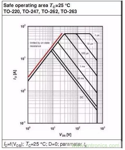 此圖中:當VDS=1V時,Y軸對應的ID為2A,Rds=VDS/ID=0.5R ==>Tj=150℃時,Rds(on)約為0.5R.當VDS=10V時,Y軸對應的ID為20A,Rds=VDS/ID=0.5R ==>Tj=150℃時,Rds(on)約為0.5R.所以,此部分曲線中,SOA表現(xiàn)為Tj_max時RDS(on)的限制.