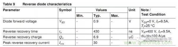 VSD,二極管正向壓降 ==>這個參數(shù)不是關(guān)注的重點,trr,二極管反向回復時間 ==>越小越好,Qrr,反向恢復電荷 ==>Qrr大小關(guān)系到MOSFET的開關(guān)損耗,越小越好,trr越小此值也會小