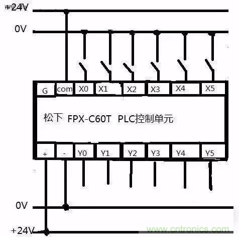 圖中松下PLC為直流匯點式輸入,即所以輸入點共用一個公共端COM,同時COM端內(nèi)帶有DC24V電源,在編寫程序時注意外部設(shè)備使用的是常閉還是常開觸點
