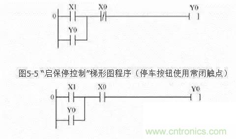 輸入端的電氣原理圖中停止按鈕SB0用常閉觸點,串在控制線中,用于停機(jī)控制。 啟動按鈕SB1用常開觸點。在設(shè)計的兩個梯形圖完成的控制功能相同,但停機(jī)信號X0使用的觸點類型不同,那么連接在端點的外部停機(jī)按鈕觸點類型也就不同