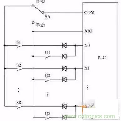 如圖上系統(tǒng)分自動和手動兩種工作方式,Q1-Q8為手動方式用到的 輸入信號,S1-S8為自動方式用到的輸入信號。S1和Q1共用輸入點X0,PLC運(yùn)行時只會用到其中一組信號,所以可以共用PLC的輸入點。(圖中二極管是用來防止寄生回路,避免錯誤輸入信號的產(chǎn)生。