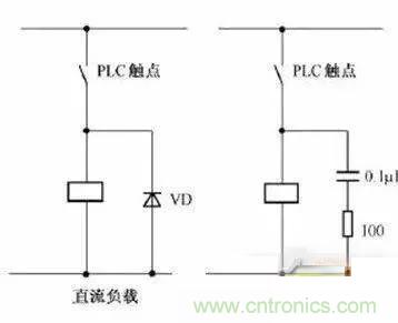當(dāng)PLC輸入輸出端接有感性負(fù)載元件時,直流輸出的續(xù)流管保護(hù)(直流電路兩端并聯(lián)續(xù)流二極管),交流輸出阻容吸收電路。