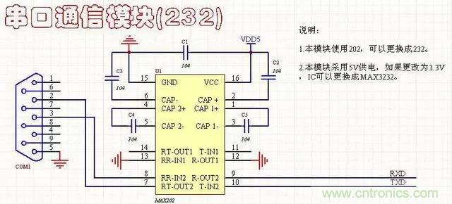 1、雙路232通信電路3線連接方式,對應(yīng)的是母頭,工作電壓5V,可以使用MAX202或MAX232.