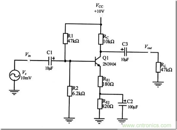 上圖是基極分壓式共射極放大電路,更為常用的電路圖如下圖所示:(圖中各參數(shù)值可以不用理會(huì),僅作說(shuō)明)