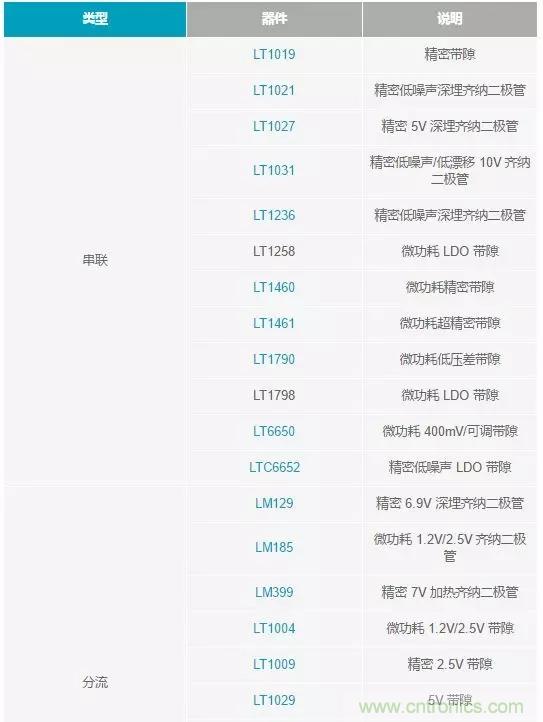 ADI生產(chǎn)各種各樣的帶隙基準(zhǔn)電壓源,包括小型廉價精密串聯(lián)基準(zhǔn)電壓源LT1460、超低功耗分流基準(zhǔn)電壓源LT1389以及超高精度、低漂移基準(zhǔn)電壓源LT1461和LTC6652??捎幂敵鲭妷喊?.2V、1.25V、2.048V、2.5V、3.0V、3.3V、4.096V、4.5V、5V和10V。這些基準(zhǔn)電壓可以在很寬范圍的電源和負(fù)載條件下提供,并且電壓和電流開銷極小。產(chǎn)品可能具有非常高的精度,例如 LT1461、LT1019、 LTC6652 和 LT1790;尺寸可能非常小,例如 LT1790 和 LT1460 (SOT23),或采用 2 m m× 2 m m D F N 封裝的 LT6660;或者功耗非常低,例如 LT1389,其功耗僅需 800nA。雖然齊納基準(zhǔn)電壓源在噪聲和長期穩(wěn)定性方面往往具有更好的性能,但新的帶隙基準(zhǔn)電壓源正在縮小差距,例如 LTC6652 的峰峰值噪聲 (0.1Hz 至 10Hz) 為 2ppm。