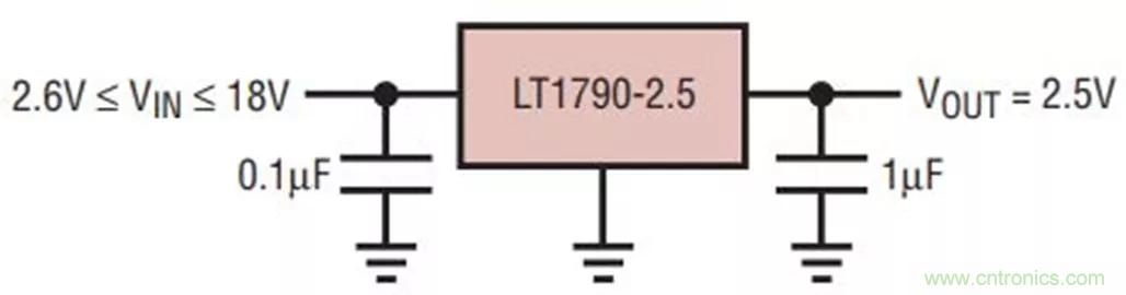 分流基準(zhǔn)電壓源的有點包括:設(shè)計簡單,封裝小,在寬電流和負(fù)載條件下具有良好的穩(wěn)定性。此外,它很容易設(shè)計為負(fù)基準(zhǔn)電壓源,并且可以配合非常高的電源電壓使用(因為外部電阻會分?jǐn)偞蟛糠蛛娢?,或配合非常低的電源電壓使用(因為輸出可以僅低于電源電壓幾毫伏)。ADI提供的分流產(chǎn)品包括 LT1004、LT1009、LT1389、LT1634、LM399 和 LTZ1000。典型分流電路如圖3所示。