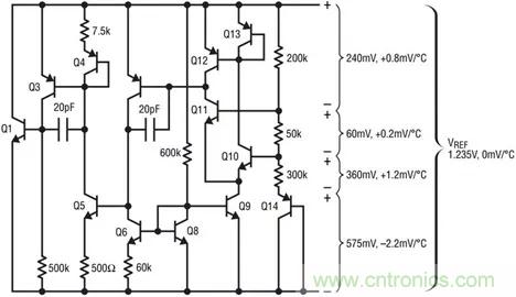 將此電壓施加到基極之間連接的50k電阻,產(chǎn)生一個與溫度成比例的電流。該電流偏置二極管Q14,25°C時其電壓為575mV,溫度系數(shù)為-2.2mV/°C。電阻用于產(chǎn)生具有正溫度系數(shù)的壓降,其施加到Q14二極管電壓上,從而產(chǎn)生大約1.235V的基準(zhǔn)電壓電位,理論上溫度系數(shù)為0mV/°C。這些壓降如圖5所示。電路的平衡提供偏置電流和輸出驅(qū)動。