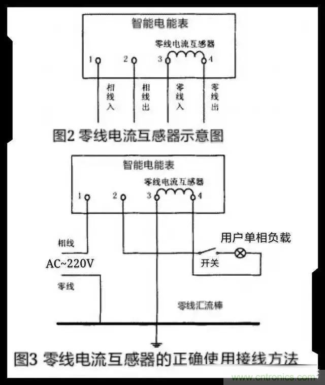 這種智能計(jì)量裝置采用微處理器和專(zhuān)門(mén)用于電能計(jì)量的芯片。它具有功能完善、計(jì)量精度高等等特點(diǎn)。而對(duì)于單相220V的用電用戶(hù)來(lái)說(shuō),現(xiàn)在的智能電能表在其內(nèi)部結(jié)構(gòu)中都已經(jīng)安裝了“零線(xiàn)電流互感器”。為了提高智能電能表的技術(shù)防護(hù)能力,在電源進(jìn)、出相線(xiàn)短接的情況下,它能夠檢測(cè)流過(guò)電能表的零線(xiàn)回路中的電流。而且國(guó)家電網(wǎng)在技術(shù)規(guī)范要求中明確提出,所有的智能電能表都必須安裝有零線(xiàn)電流互感器測(cè)量、記錄的功能。請(qǐng)看下圖所示